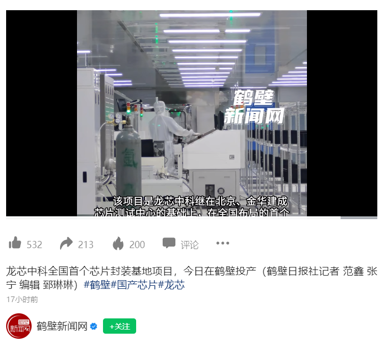 本站 10 月 13 日消息,据鹤壁日报报道,10 月 12 日下午,龙芯中科芯片封装基地项目投产仪式在鹤壁科创新城举行。龙芯中科芯片封装基地位于鹤壁科创新城百佳智造产业园,是龙芯中科在全国布局的首个芯片封装项目。