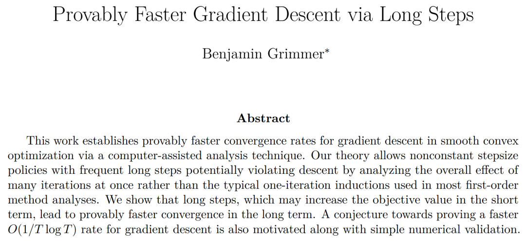 这篇论文为《Provably Faster Gradient Descent via Long Steps》,唯一作者为约翰霍普金斯大学应用数学与统计学助理教授 Benjamin Grimmer。他对于自己的发现感到非常惊讶,就像直觉被打破一样。