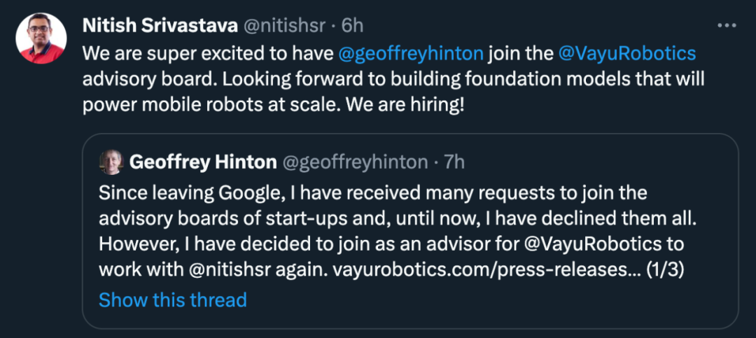 「自从离开谷歌之后,我收到过很多初创公司邀请我加入其顾问委员会的消息,但都拒绝了。然而,现在我决定以顾问的身份加入 VayuRobotics,再次与 Nitish Srivastava 共事。」
