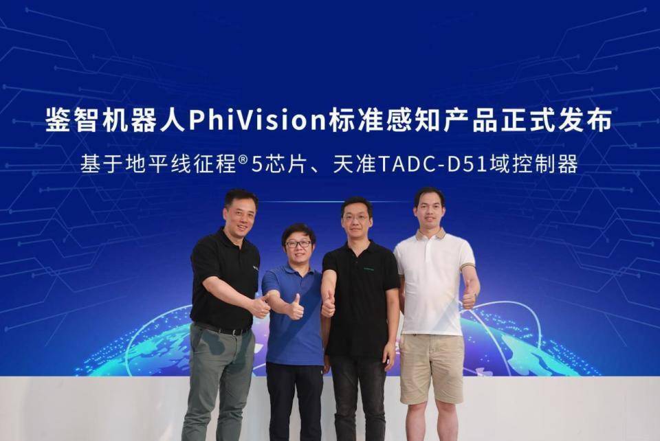 【鉴智机器人发布地平线生态内首个基于单颗征程5的全自研标准感知产品PhiVision(左起:地平线首席生态官徐健,鉴智机器人联合创始人兼CTO都大龙,天准科技副总裁刘军传,鉴智机器人副总裁兼感知产品线负责人梁柱锦 )】