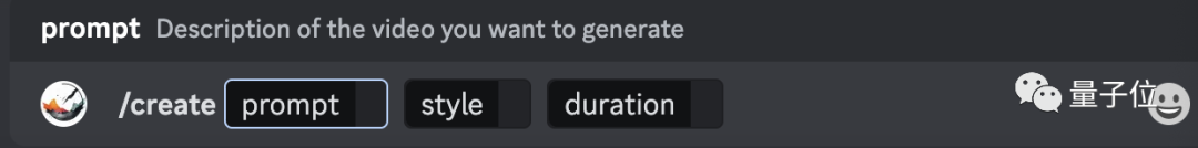 在聊天框中输入“/create”,系统就会自动给你格式,提示你填写提示词、风格和时长。