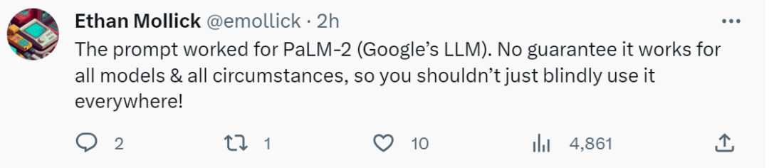 不过有研究者表示:「深呼吸,一步一步地来」这个提示在谷歌的 PaLM-2 上非常有效(准确率为80.2)。但我们不能保证它适用于所有模型和所有情况,所以我们不应该盲目地到处使用它。
