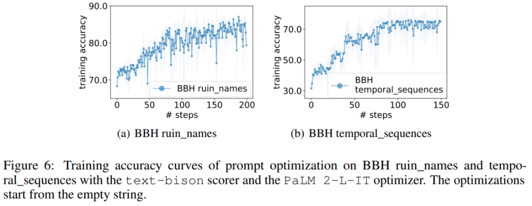 图 1 (a) 显示了使用预训练的 PaLM 2-L 作为评分器和 PaLM 2-L-IT 作为优化器的即时优化曲线,可以观察到优化曲线整体呈上升趋势,在整个优化过程中出现了几次跳跃: