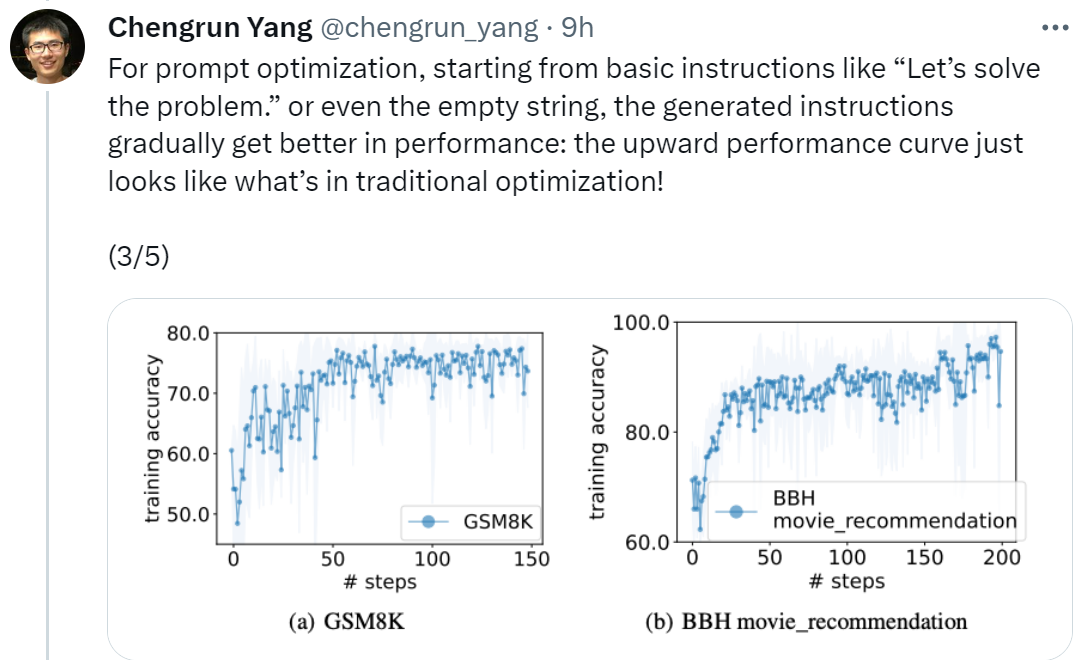论文一作、 Google DeepMind 的研究科学家 Chengrun Yang 表示:「为了进行提示优化,我们从『让我们开始解决问题』这样的基本指令开始,甚至是空字符串,最终 OPRO 生成的指令会使 LLM 性能逐渐变好,如下图所示的向上的性能曲线看起来就像传统优化中的情况一样!」