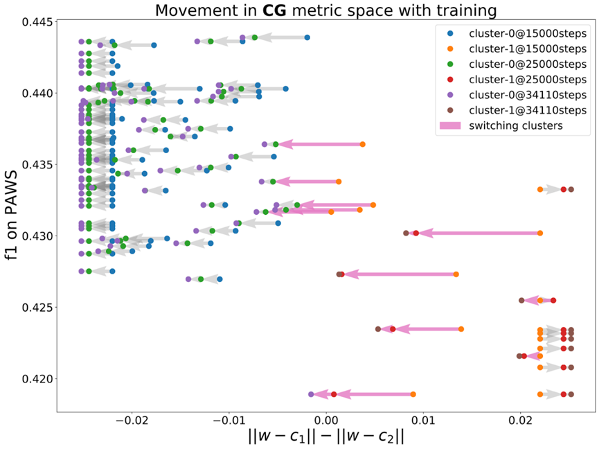需要证明训练轨迹可能会陷入损失表面上的一个盆地(basin),从而解释训练模型中泛化行为的多样性。实际上,在检查了训练过程中的几个检查点后,发现位于簇中心的模型会在训练过程中与其簇中的其他模型建立更强的联系。然而,有些模型还是能够成功地转向一个更好的簇。