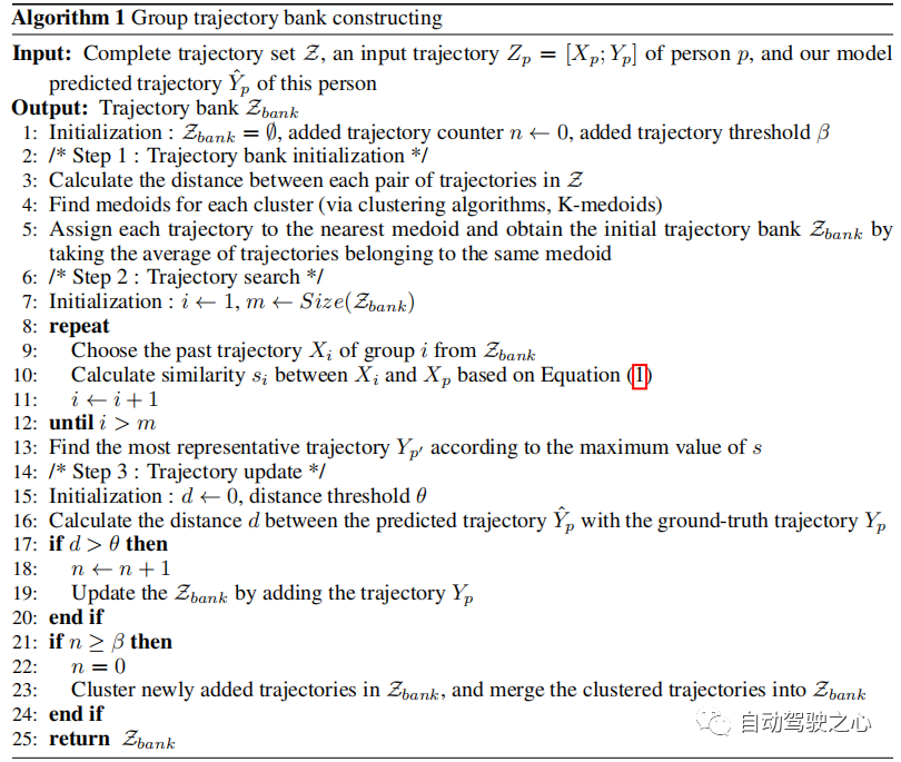 轨迹库初始化 由于大量记录的轨迹存在冗余,我们不是简单地使用它们,而是生成一组稀疏且有代表性的轨迹作为轨迹库的初始值。 具体来说,我们将训练数据中的轨迹表示为 并将每个 分成一对观测轨迹 和未来轨迹 ,从而将 分成观测集 以及相应的未来集合 。 然后,我们计算,中每对轨迹之间的欧氏距离,并通过K-medoids聚类算法获得轨迹簇。 的初始成员是属于同一集群的轨迹的平均值(参见算法 1,步骤 1)。中的每条轨迹都代表了一群人的移动模式。
