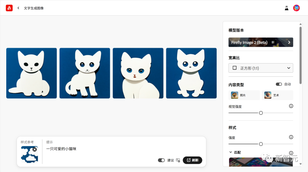 类似于其他生图AI的「风格转换器」功能,生成匹配功能能根据用户给定的一幅图片,生成风格和内容都有高度相似性的图片,可以理解为Adobe版本的「image to image」功能。
