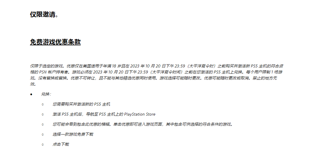 现在,索尼在条款正上方加入了“仅限邀请”四个大字。也就是说,只有被官方邀请到的玩家才能免费领取游戏,而在此前官宣该活动时的条款页面并没有这个字眼。