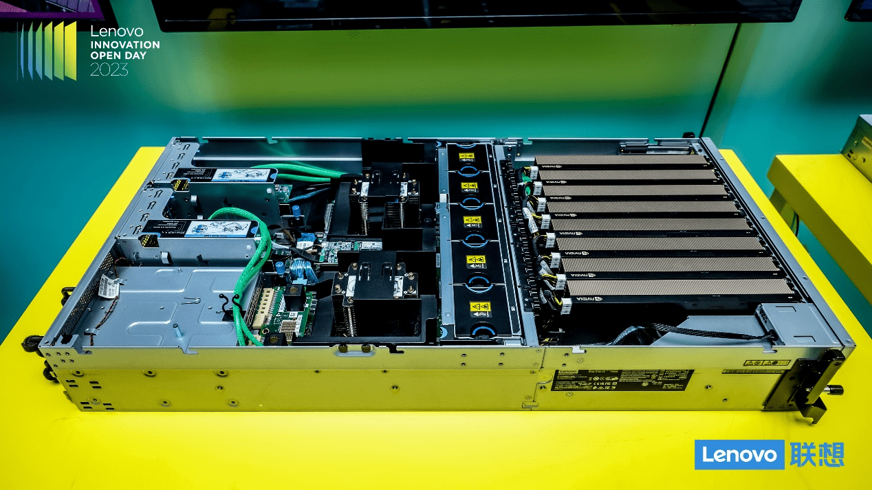 2023联想创新开放日现场展示的联想ThinkSystem SR670 V2采用3U高密度设计,搭载两个第三代英特尔至强可扩展处理器,不仅最早支持NVIDIA的Hopper旗舰型GPU,更可以支持庞大的NVIDIA Ampere数据中心产品组合。其中,8-DW GPU型号最多支持8个双宽全高型PCIe 4.0*16 GPU,并可通过NVLink两两互联,实现显存的叠加和性能扩展,从而最大限度满足AI计算工作负载的需求。