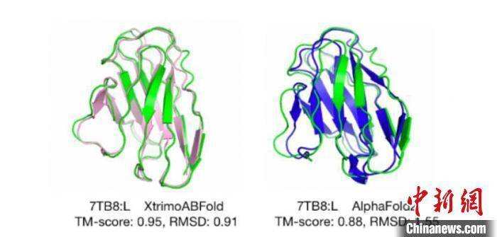 图为在预测抗体结构表现上“xTrimoABFold”和“AlphaFold2”的对比 百图生科 供图