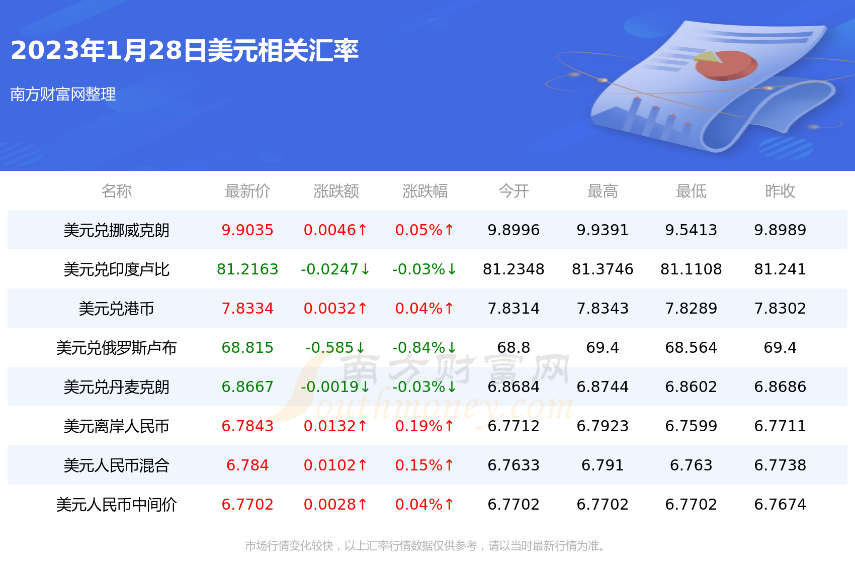 2023年1月28日美元兑换港币最新汇率:7.8334,今开:7.8314,昨收:7.8302,最高:7.8343,最低:7.8289。