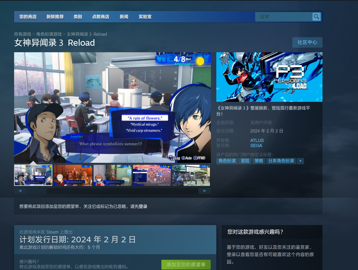 ▲ 图源 Steam 相关页面 《女神异闻录 3:Reload》游戏日前已经在 Steam 开售,本作支持中文,标准版为 349 元、数字豪华版为 399 元、数字高级版为 499 元。