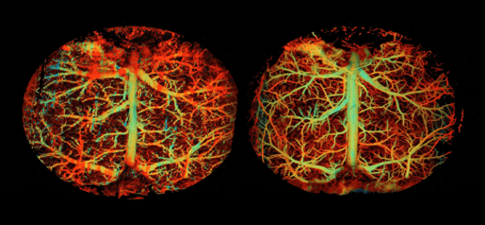 小鼠大脑血流的视图(左)以及使用 AI 工具提高图像质量和准确性后得到的相同视图。图源:杜克大学 Junjie Yao、Xiaoyi Zhu 。