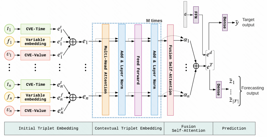 一般这种不规则时间序列建模方法,常见的结构是将上述triple数据分别embedding后,拼接到一起,输入到transformer等模型中,这种方式将每个时刻的信息,以及每个时刻的时间表征融合到一起输入到模型,进行后续任务的预测。