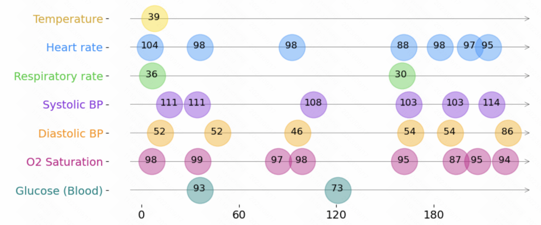 以下是不规则时间序列数据的一种表示形式,如下图所示。每个时间序列由一组三元组组成,每个三元组包含时间、数值和特征三个字段,分别表示时间序列中每个元素的采样时间、数值和其他特征。除了这些三元组之外,每个序列还包括其他不随时间变化的静态特征,以及每个时间序列的标签