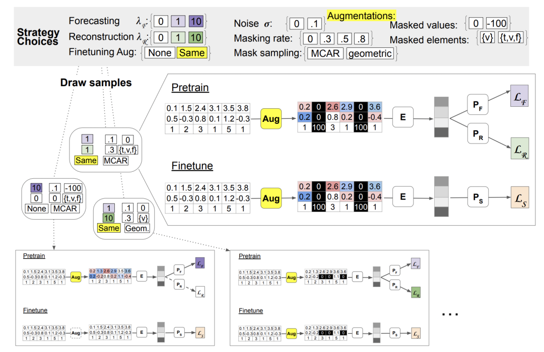 在Forecasting pretraining中,对于时间序列中的每个特征,根据某个大小的时间窗口前序序列,预测它的取值。这里的特征指的是triplet中的feature。由于每种feature在一个时间窗口中可能出现多次,或者不会出现,因此文中采用了这个feature第一次出现的值作为label进行预训练。这其中输入的数据包括原始序列,以及增强后的时间序列。