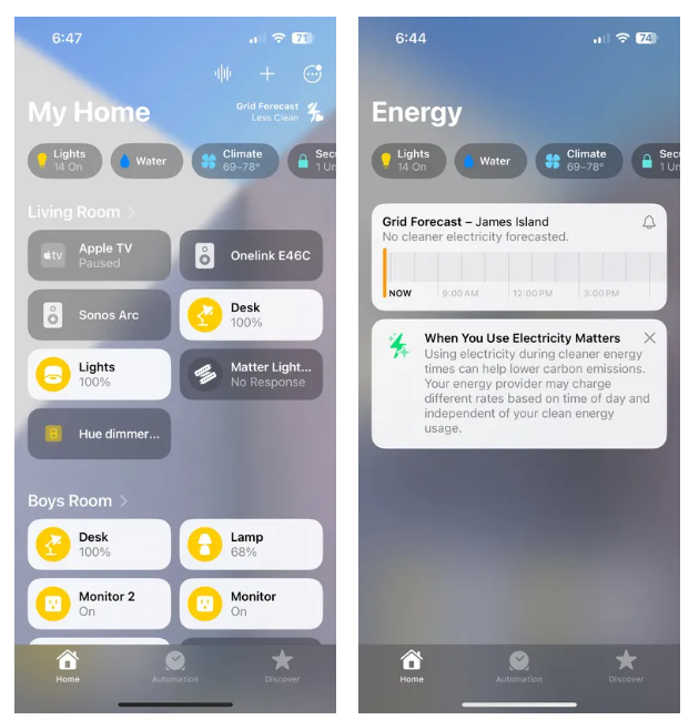 随着iOS 17的发布,电网预测是Apple Home中的一个新工具,其可显示电网何时有相对清洁或不太清洁的能源可用。这有助于决定何时运行滚筒烘干机或为电动汽车充电,以便在消耗较高时利用“更清洁”的能源。