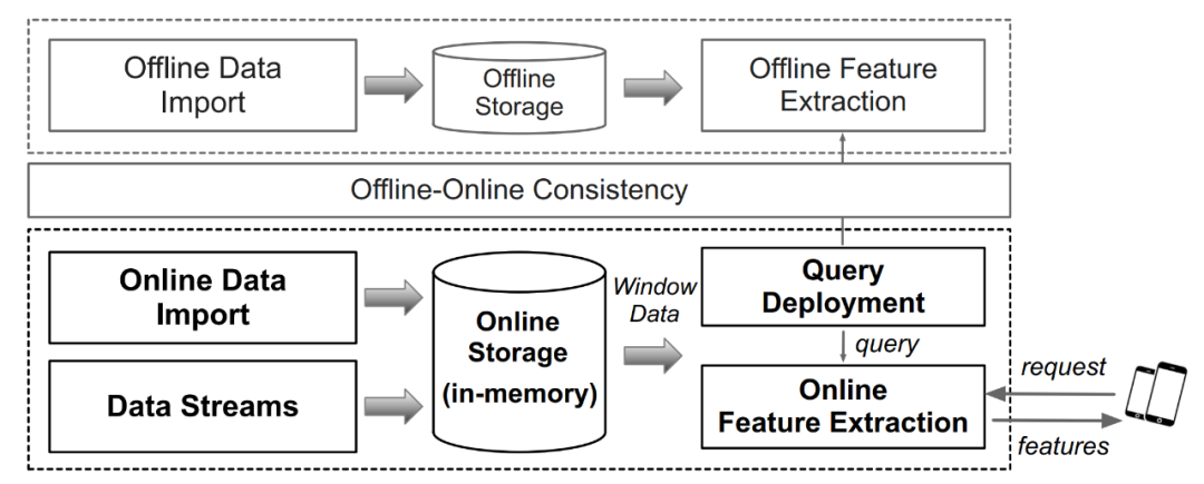 线上线下一致性:由于机器学习应用一般会分为线上和线上两个流程,即基于历史数据的训练和基于实时数据的推理。因此确保线上线下的特征计算逻辑一致性,对于保证线上线下最终业务效果一致至关重要。