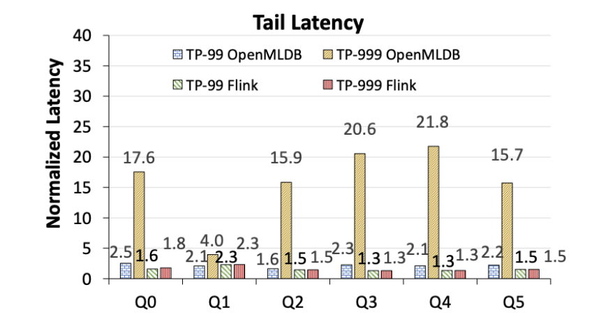图 7. OpenMLDB 与 Flink 的尾延迟对比(归一化到各自的 TP-50 延迟)