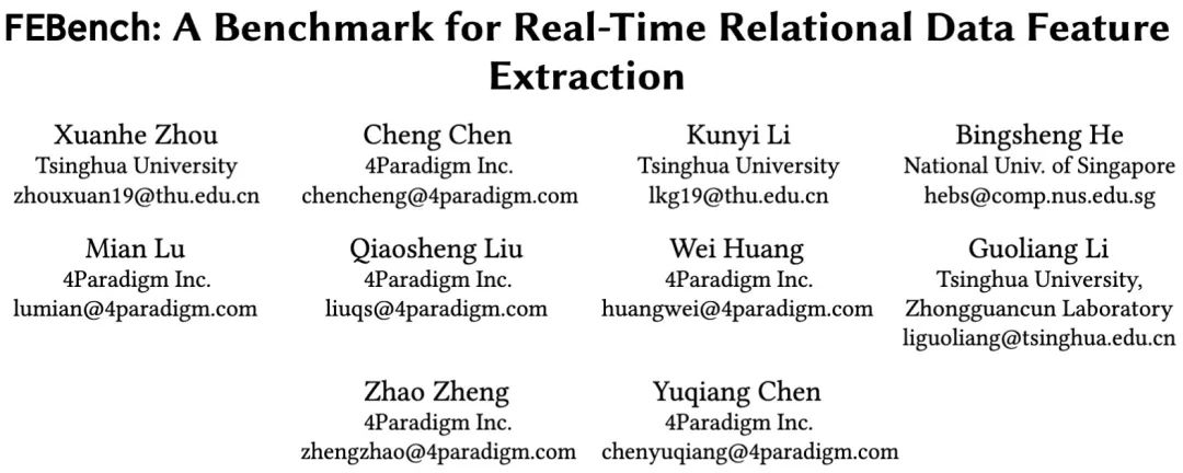 这篇论文是由第四范式、清华大学和新加坡国立大学合作完成的。论文提出了一个基于工业界真实场景积累的实时特征计算测试基准,用于评估基于机器学习的实时决策系统