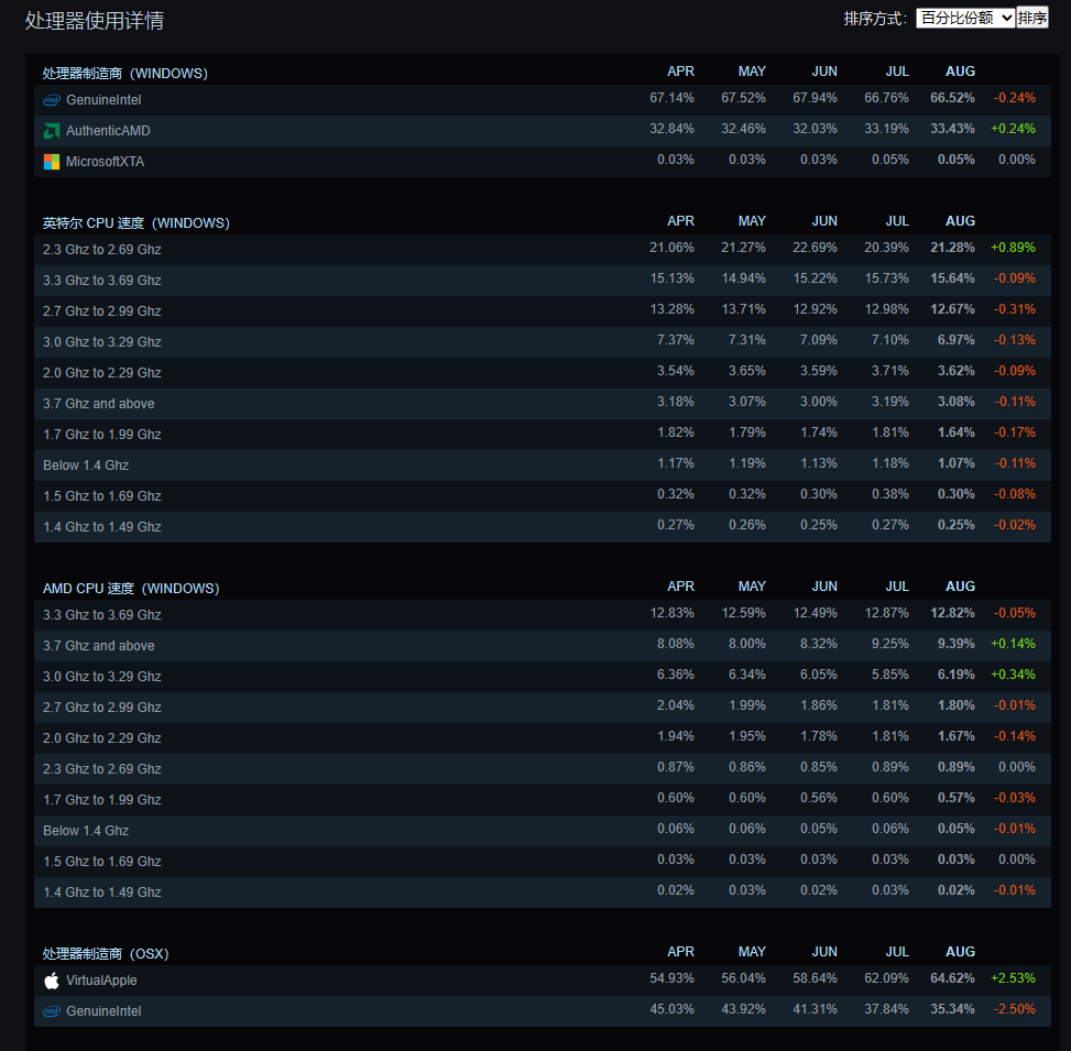 CPU 方面,AMD 连续第二个月缩小与英特尔的差距,上升了 0.24%,占据了 33.43% 的份额,而且本站还注意到 MacOS 中的英特尔处理器份额同样也是呈现出走低的趋势。