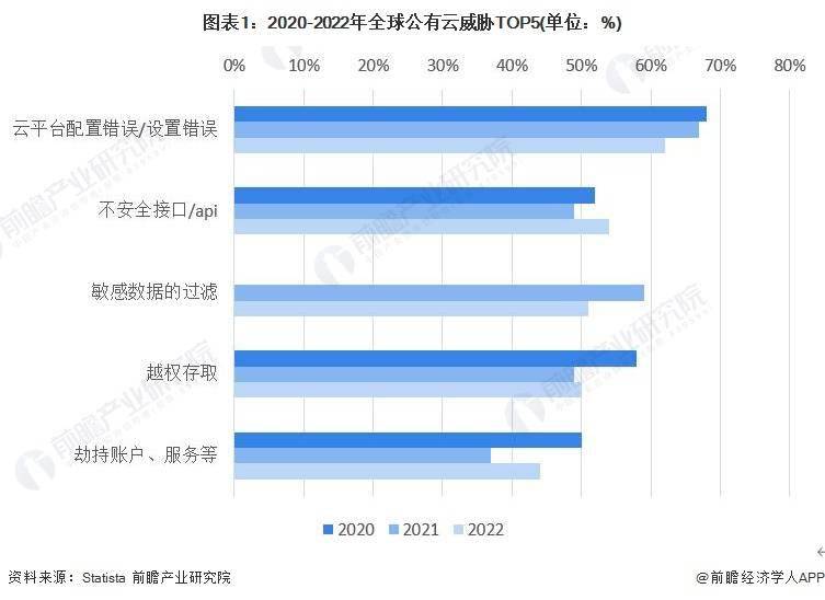2020-2022年,全球公有云安全的最大威胁为云平台配置错误,但整体呈下降趋势。第二大威胁来自不安全的接口/api,有超过50%的厂商认为不安全的接口能够直接导致云平台受到外部威胁。