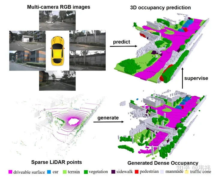最近一直在疯狂找工作,没有闲下来写,正好最近提交了camera-ready,作为一个工作的收尾觉得还是写个知乎总结下。其实文章部分的介绍各个公众号写的已经很好了,也感谢他们的宣传,大家可以直接参考自动驾驶之心的自动驾驶之心:nuScenes SOTA!SurroundOcc:面向自动驾驶的纯视觉3D占据预测网络(清华&天大)。总的来说,contribution分为两块,一部分是如何利用多帧的lidar点云构建稠密occupancy数据集,另一部分是如何设计occupancy预测的网络。其实两部分的内容都比较直接易懂,大家有哪块不理解的也可以随时问我。那么这篇文章我想讲点论文之外的事情,一个是如何改进当前方案使其更加易于部署,另一个是未来的发展方向。