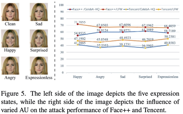 值得注意的是,该研究采用表情状态空间来实例化 GMAA 攻击范式。这是因为表情是人面部活动中最常见的一种状态,而且表情状态空间相对稳定,不会受到人种、性别的影响(光照可改变肤色、化妆则会影响性别)。事实上,只要能找到其他合适的状态空间,该攻击范式就完全可以被推广应用于自然界的其他对抗攻击任务中。