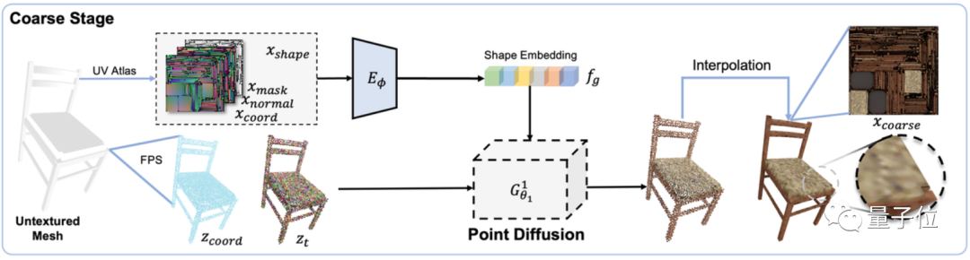 首先在“粗设计”模块中,训练一个以形状特征(包括表面法线、坐标和遮罩)为输入条件的3D扩散模型,用来预测物体形状中每个点的颜色,从而生成一个粗糙纹理图像效果: