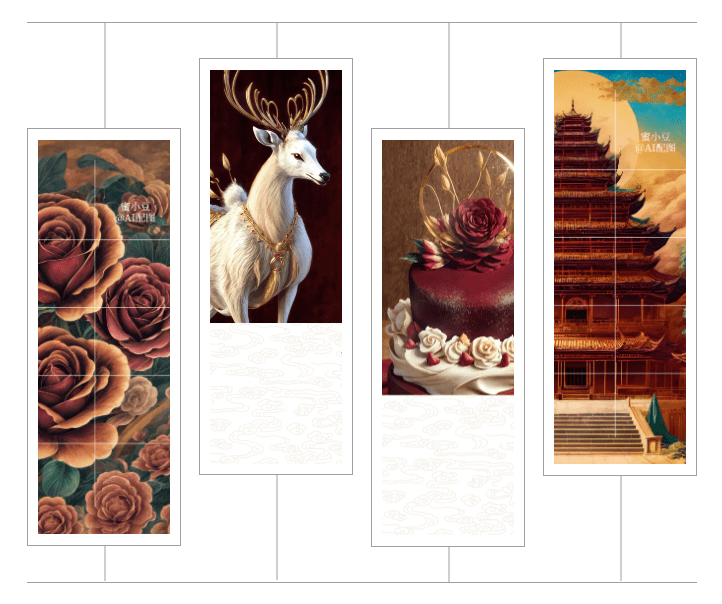 除了经典的敦煌飞天造型之外,蜜小豆“AI配图”还能以敦煌壁画中的动物造型风格为灵感,进行衍生创作。此外,蜜小豆还能生成山水风景、建筑、服饰、纹样、食物等图像,犹如一个触手可及的纸上奇幻博物馆。