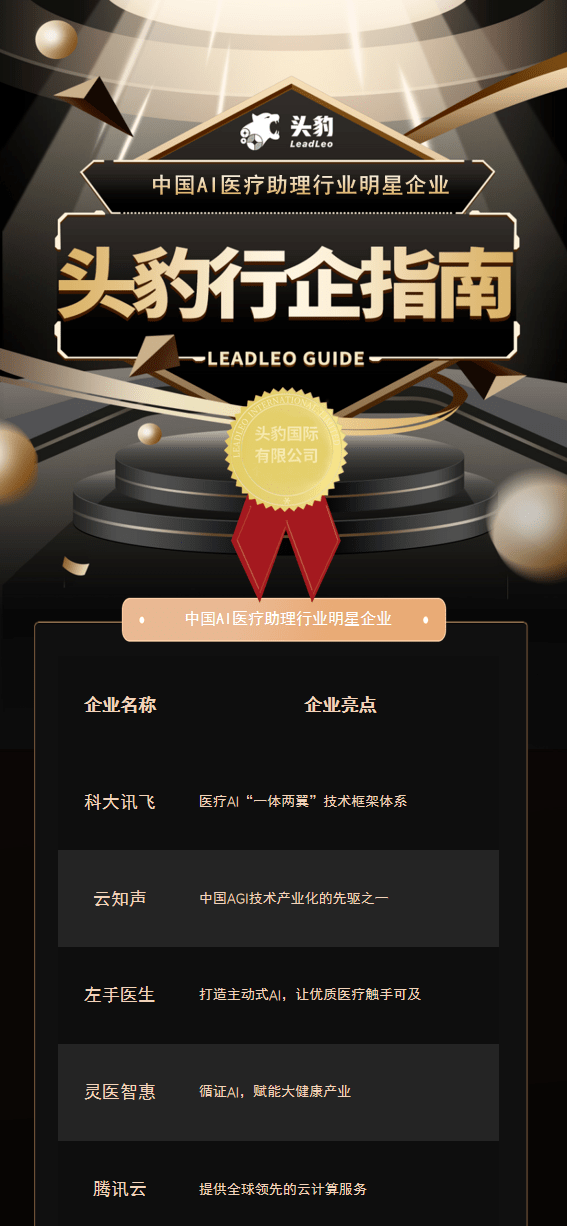 最近,国内著名的企业研究和原创内容平台头豹发布了《头豹行企指南》,其中一张图介绍了中国人工智能医疗助理行业的明星企业。云知声凭借其在智能医疗领域的领先能力和卓越的行业实践价值,成功入选了“中国人工智能医疗助理行业明星企业”榜单