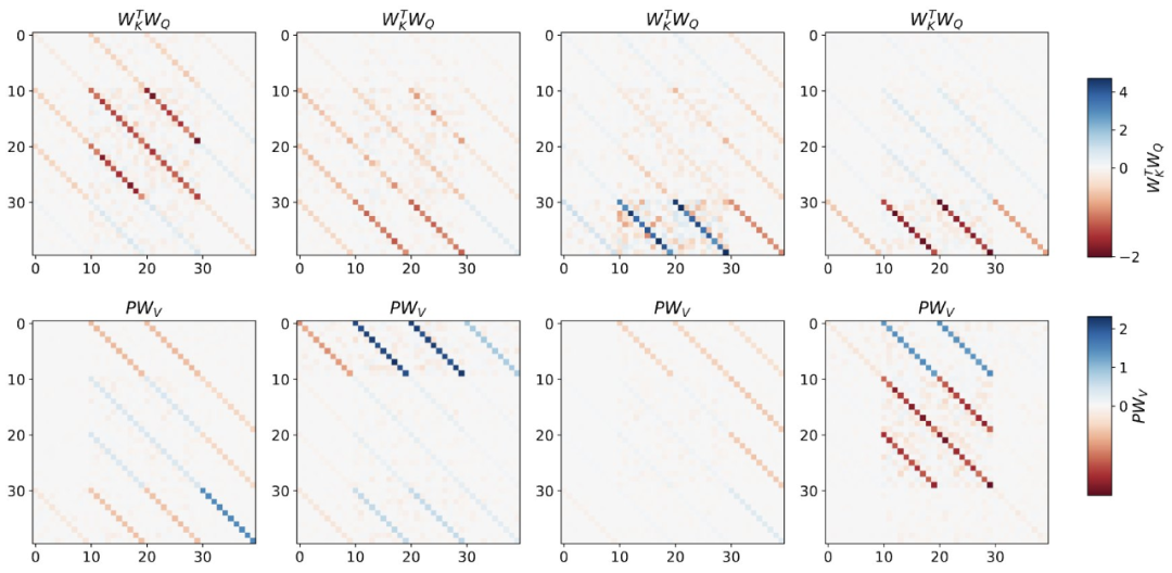 ,这对应于选择 W_0 = 0。 与单层模型一样,作者在训练模型的权重中看到了清晰的结构。作为第一个逆向工程分析,该研究利用这个结构并构建一个算法(RevAlg-d,其中 d 表示层数),每个层头包含 16 个参数(而不是 3200 个)。作者发现这种压缩但复杂的表达式可以描述经过训练的模型。特别是,它允许以几乎无损的方式在实际 Transformer 和 RevAlg-d 权重之间进行插值。