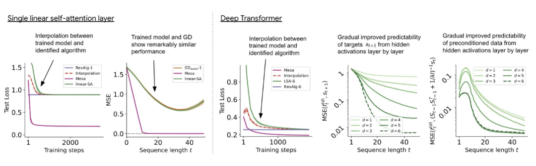 在图 3 所示的深度线性自注意力 Transformer 上,我们可以看到两个探针都可以线性解码,解码性能随着序列长度和网络深度的增加而增加。因此,基础优化发现了一种混合算法,该算法在原始 mesa-objective Lt (W) 的基础上逐层下降,同时改进 mesa 优化问题的条件数。这导致 mesa-objective Lt (W) 快速下降。此外可以看到性能随着深度的增加而显着提高。