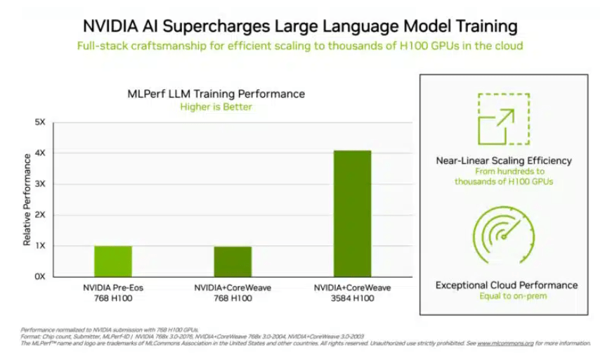 在投资者比较关注的“大语言模型”训练测试中,英伟达和GPU云算力平台CoreWeave提交的数据为这项测试设定了残酷的业界标准。在896个英特尔至强8462Y 处理器和3584个英伟达H100芯片的齐心协力下,仅仅花了10.94分钟就完成了基于GPT-3的大语言模型训练任务。