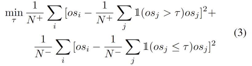 我们观察到离群值服从双峰分布,如图 3 所示。因此,我们没有指定固定阈值,而是将最佳阈值定义为分离两种分布的的最佳值。具体来说,问题可以表述为将离群值分为两个簇,最佳阈值将最小化中的簇内方差。优化下式可以通过以 0.01 的步长穷举搜索从 0 到 1 的所有可能阈值来有效实现。