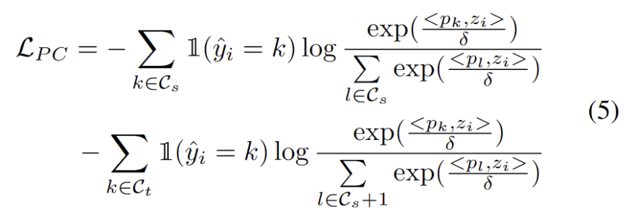 受到域适应任务中使用聚类的工作启发 [3,4],我们将测试段训练视为发现目标域数据中的簇结构。通过将代表性原型识别为聚类中心,在目标域中识别聚类结构,并鼓励测试样本嵌入到其中一个原型附近。重写内容为:聚类分析的目标定义为最小化样本与聚类中心余弦相似度的负对数似然损失,如下式所示。