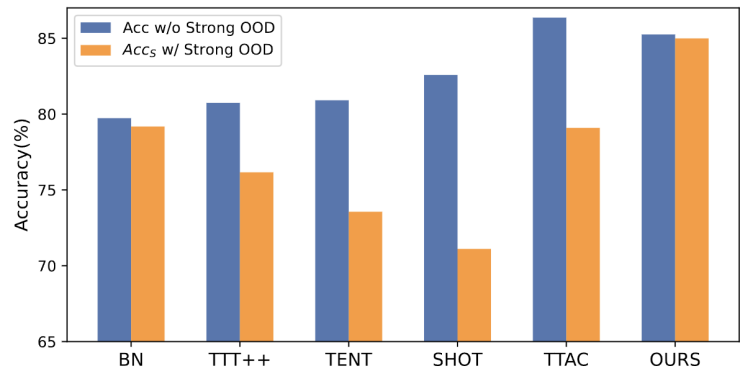 - 基于自训练的 TTT 很难处理强 OOD 样本,因为它必须将测试样本分配给已知的类别。尽管可以通过应用半监督学习中采用的阈值来过滤掉一些低置信度样本,但仍然不能保证滤除所有强 OOD 样本。