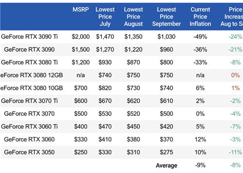 RTX 3090 Ti - 建议售价$2,000/九月最低售价$1,030,相较8月下跌24%