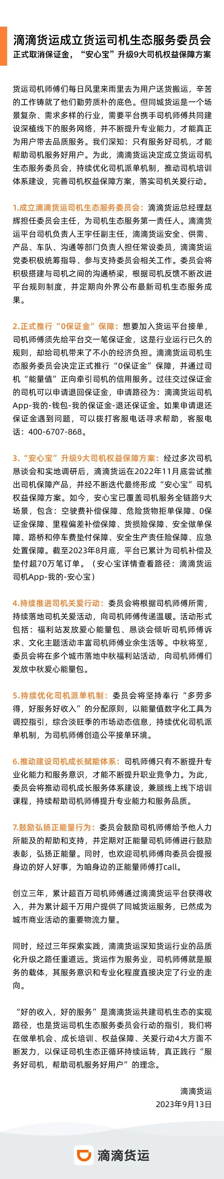滴滴货运宣布设立司机生态服务委员会,取消司机注册保证金