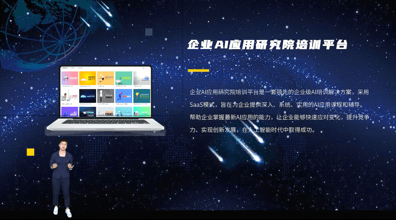 张君英女士介绍,企业AI应用研究院培训平台是一套领先的企业级AI培训解决方案,它采用的是SaaS模式,旨在为企业提供深入、系统、实用的AI应用课程和辅导。帮助企业掌握最新AI应用的能力,让企业能够快速应对变化,提升竞争力、实现创新发展,可以在人工智能时代中取得成功。