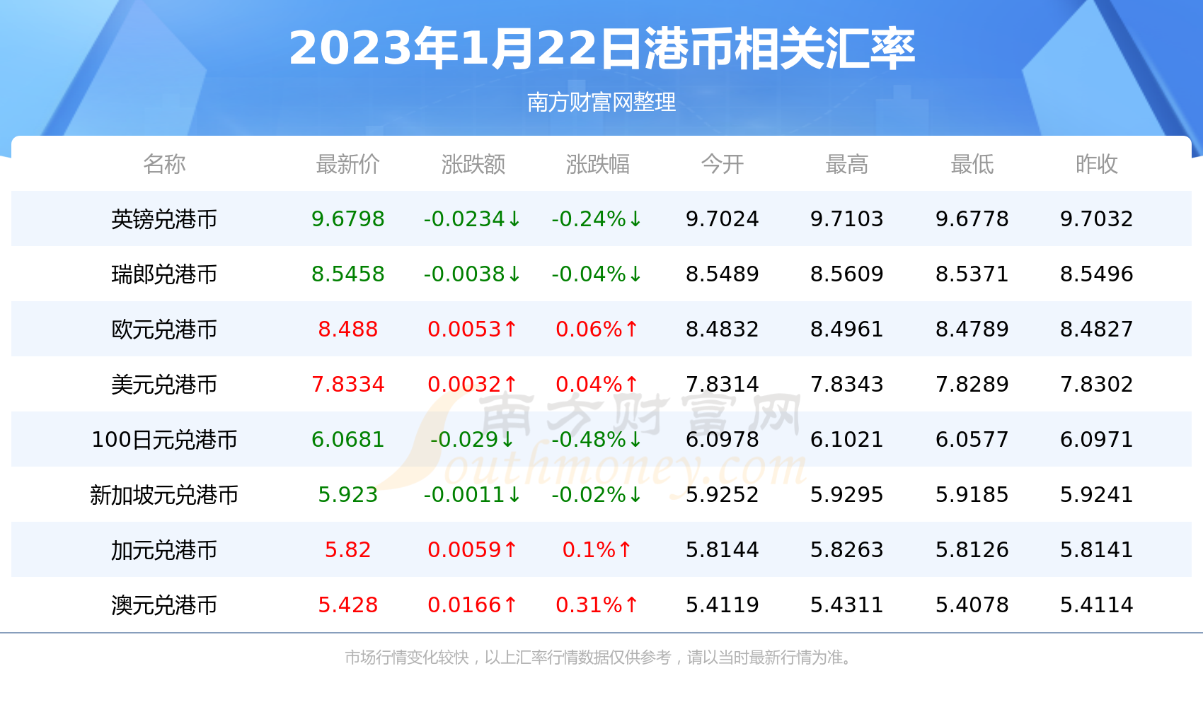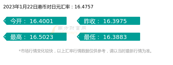 根据2023年1月22日汇率,港币兑换日元汇率最新价16.4757,今开价16.4001,昨收价16.3975,最高价16.5023,最低价16.3883。