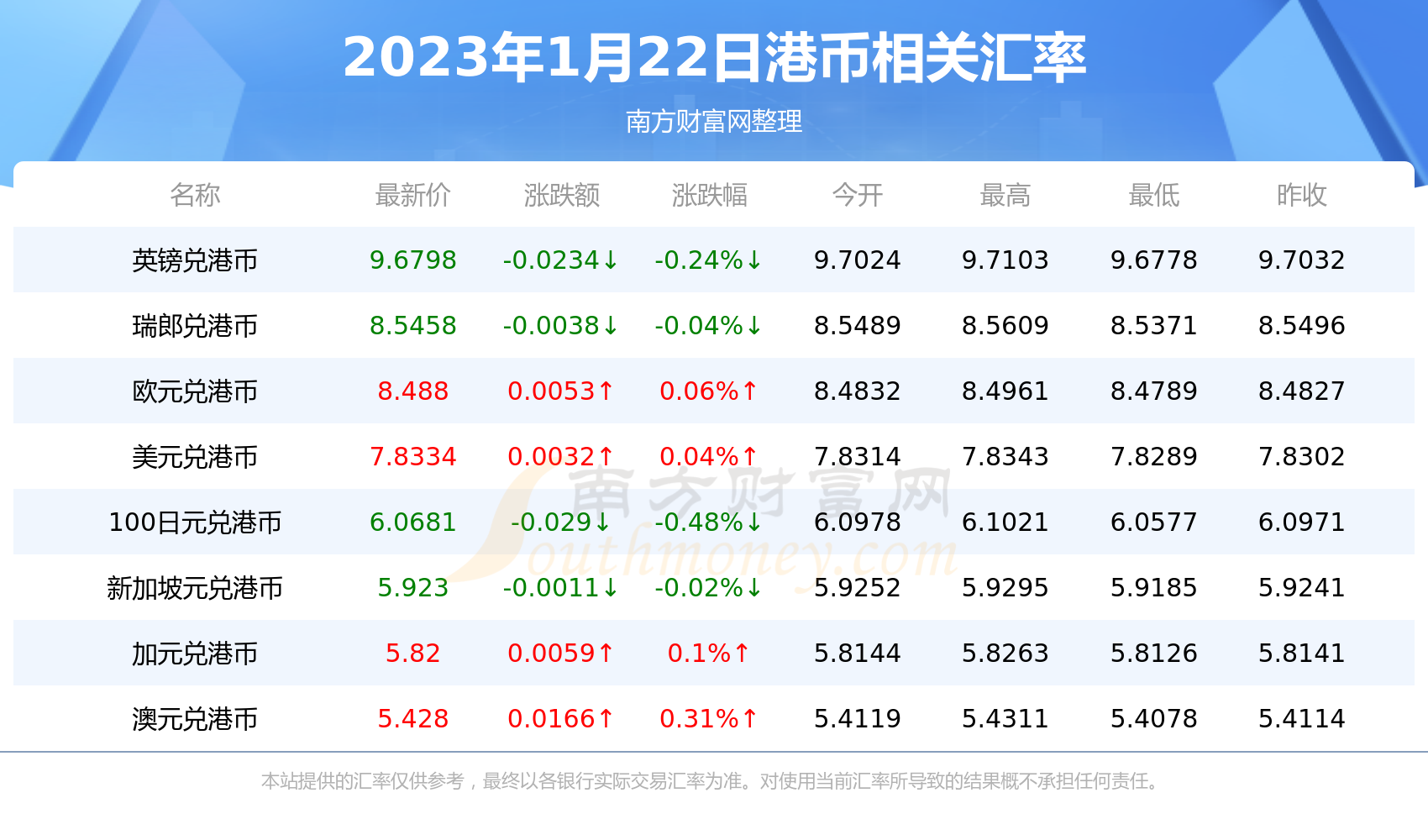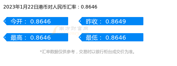 根据2023年1月22日汇率,港币兑换人民币汇率最新价0.8646,今开价0.8646,昨收价0.8649,最高价0.8646,最低价0.8646。