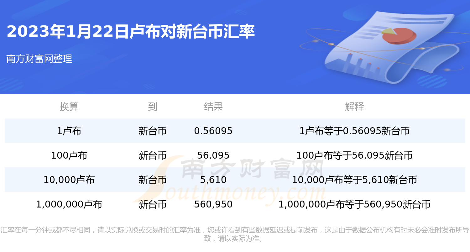 2023年1月22日,货币兑换:1卢布等于0.56095新台币。举例:假如一瓶矿泉水需要1卢布,则需新台币:0.56095新台币。
