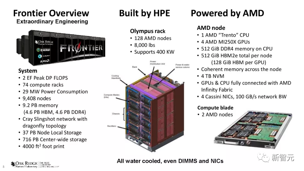 散热方面,基于水冷的系统让6000加仑的水在350马力的泵在整个系统中「移动」,由此将温度控制在了85度左右。 直观来说,这些水泵可以在30分钟内填满一个奥林匹克标准游泳池。 Frontier不仅是现在世界上最快的超算,也是最环保的超算。