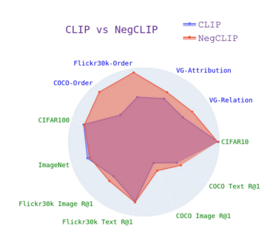 不同基准上的NegCLIP模型与CLIP模型。其中,蓝色基准是我们介绍的基准,绿色基准来自网络文献(图片由作者提供)