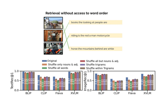 我们测试模型的任务是使用打乱的标题进行检索。即使我们打乱标题,模型也可以正确地找到相应的图像(反之亦然)。这表明检索任务可能过于简单,图片由作者提供。