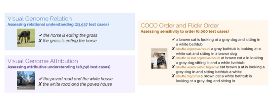 我们创建的不同数据集包括Relation、Attribution和Order。对于每个数据集,我们显示一个图像示例和不同的标题。其中,只有一个标题是正确的,模型必须识别出这个正确的标题。