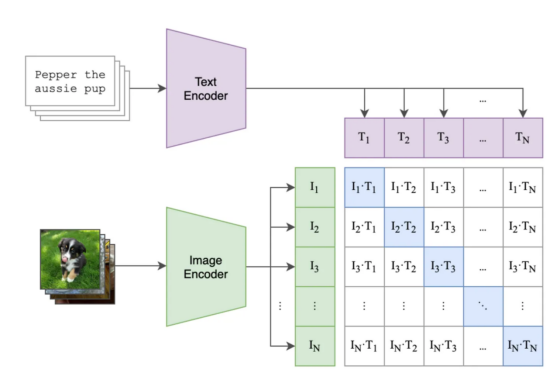 CLIP模型中的对比预训练(其中,蓝色方块是我们想要优化相似性的图像-文本对)