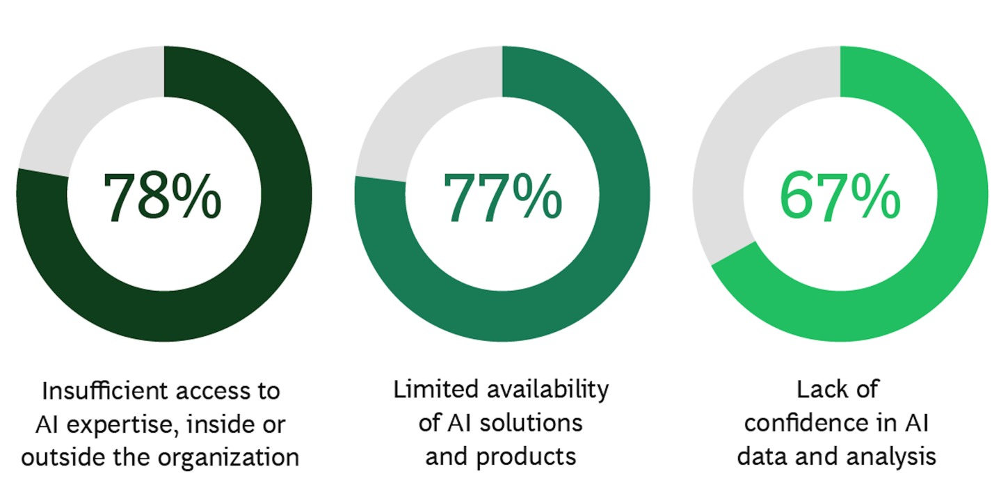 BCG 调查中大约 78% 的受访者表示,他们无法获得足够的 AI 专业知识和资源。来源:波士顿咨询集团