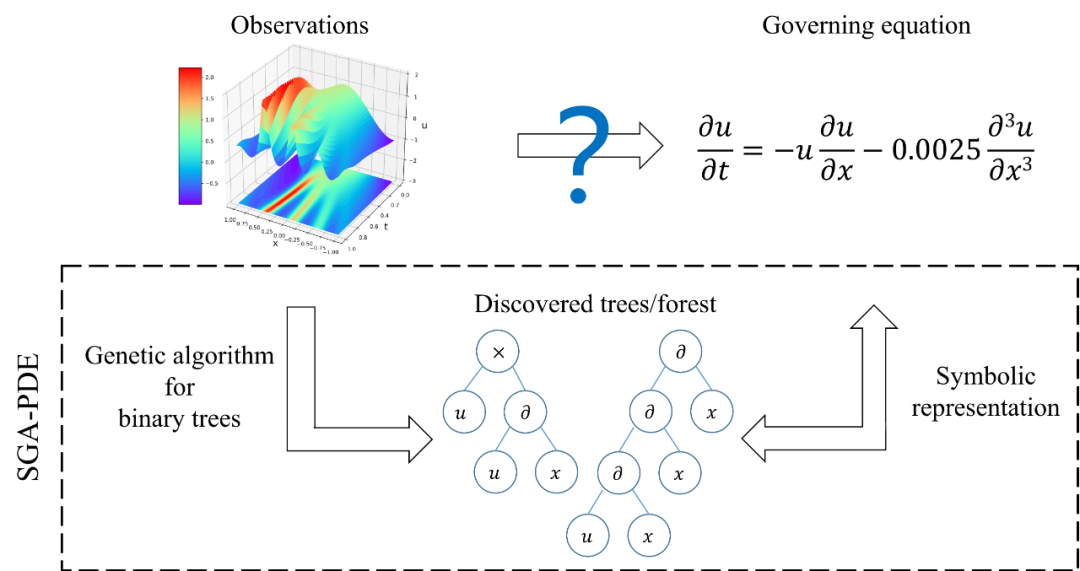 SGA-PDE 通过符号数学的方法对方程进行转化,解决了任意形式的偏微分方程的表示问题。此外,SGA-PDE 采用针对二叉树设计的遗传算法,通过对树的拓扑结构以及节点属性的迭代优化,从开放域中自动挖掘符合观测数据的控制方程。在优化中,SGA-PDE 不依赖于方程形式的先验信息,也无需给定候选集,实现了对复杂结构方程的自动寻优。同时,SGA-PDE 也是无梯度算法,避免了方程结构与损失值之间梯度难以计算的问题。